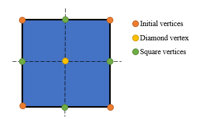 The essence of the algorithm is division and displacement at the point of division. You start with a square and split it in the middle both vertically and horizontally, doing this yields 5 new points. Once the new points are obtained height is sampled from the points around the new point and a random offset is added, this sampling is done in two steps, a Diamond step from which the center point derives its new displacement and a square step that derives the height of the other four points. Diamond step is first simply because the Square step requires the newly acquired height.